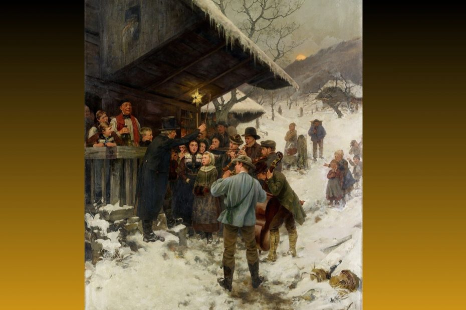 Algunos vecinos bajan por la ladera hacia la fuente, que mana agua a pesar del helado entorno. Unos niños acuden en tropel atraídos por la música. Frente a una típica casa suiza, de madera, de la que cuelgan carámbanos del tejado, se cantan villancicos. Dirigidos por el maestro de escuela, y organista de la iglesia, el improvisado coro navideño llena de alegría el ambiente. Se apiñan en torno a la brillante linterna con forma de estrella que porta en lo alto, a modo de enseña o cruz de guía, uno de los muchachos, y que concurre ya con la apagada luz del sol. Subido sobre unos peldaños de piedra, sobre la nieve, y con el arco de su violín como batuta, el esforzado maestro dirige a los rústicos músicos: a los lados del viejo del clarinete, dos violines; luego un hombre alto que, aplicado, se inclina sobre su contrabajo; cierra al grupo, de espaldas a nosotros, ese apuesto joven con sombrero y bigote que toca su trompa de caza. En el centro los niños, con sus sonrosadas caras y voces angelicales.